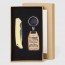 Ambos detalles vienen presentados en una caja de cartón, la tapa viene con un blíster transparente para poder ver el detalle sin necesidad de sacarlo de la caja. Las dos piezas vienen sujetas en su hueco con la medida perfecta. El llavero viene presentado con tres frases diferentes originales y divertidas. El llavero mide 11 cm de alto (incluyendo la argolla) y 3 cm de ancho y la navaja esta fabricada de acero inoxidable, su mango es de madera con un tono de color amarillo.